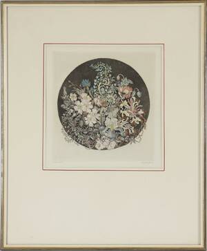 Färglagd etsning, "Flora Aestiva". Signerad. Inramad. (17x18)
