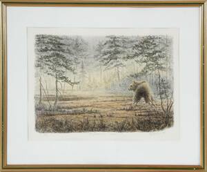 Färglitografi, skogsbild med björn. Signerad och daterad 96. Inramad. Bladet buligt. (26x37)
