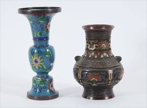 Med cloissonne-dekor. En undertill signerad. En med emaljsläpp. (Höjd 18-22)
