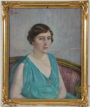 Olja på duk, "Porträtt av friherrinan Karin Fredrika Elisabeth Fleetwood". Daterad 1923. Signerad a tergo H.Kjellstedt. Förgylld ram. Glas med spricka. (62x49)