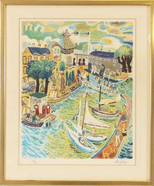 Färglitografi, hamnbild. Signerad och numrerad. Inramad. (56x44)