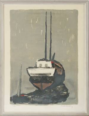 Färglitografi, motiv med båt. Signerad och numrerad. Inramad. (56x39)