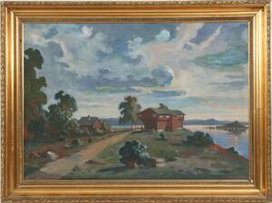 Olja på duk, motiv från Ornässtugan. Otydligt signerad. Dukhål. (49x68)