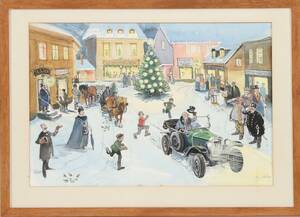 Akvarell, stadsbild med figurer. Signerad. Nedre kant med fläck, ram saknar glas. (36x51)