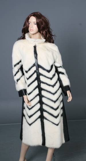 Pelsfrakke af hvid mink og sort kalveskind. Cirka str. 40-42, fremstår med trykknapper, hægte ved halslukke og sidelommer. Ærmelængde ca. 55, længde ca. 115cm, brystvidde ca. 110cm. Fremstår med minimal brugspræg. Indvendig med sort foer og taljesnøre.