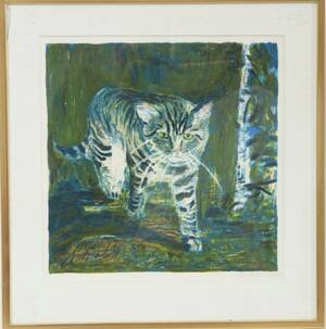 Färglitografi, motiv med katt. Signerad och numrerad. Inramad. Glasets ena hörn med spricka. (40x40)