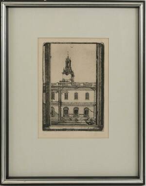 Etsning, "Storkyrkan och börshuset". Provtryck. Signerad. I plåten daterad 1925. Inramad. (16x23)