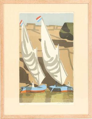 Färglitografi, motiv med segelbåtar. Signerad och numrerad. Inramad. (56x34)