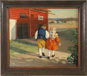 Olja på duk, gårdsbild med pojke och flicka. Signerad V.Gotthard?. (54x66)