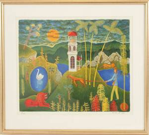 Färglitografi, landskap med figurer. Signerad och numrerad. Daterad 74. Inramad. (42x52)
