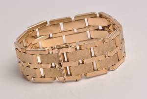 Blok armbånd af 14 kt. guld, lås med dobbelt sikkerhedshasp. Stemplet JøS for Jørgen Smed. L. 18,5 cm. Vægt ca. 29,6 gr. Fremstår med brugsspor. Läs mer...