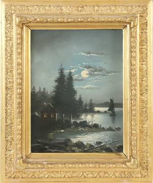 Olja på pannå, månbelyst landskap. I samtida ram. Ram med dekorlagning. (40x29)