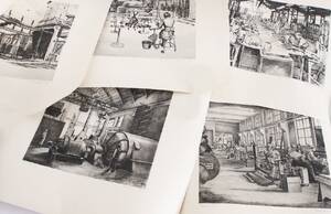 Etsningar 5st, fabriksmotiv. Oramad. (Bladmått 36x40)
