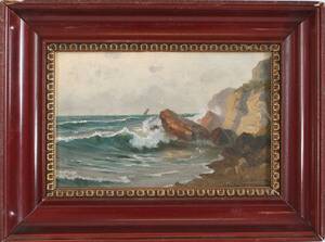 Olja på pannå, kustlandskap. Signerad C Lindström. Mindre färgsläpp. (14x22)