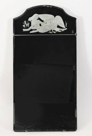 Krön med slipad dekor av kvinna och svan. Monogramsignerad. (Höjd 70, bredd 35)