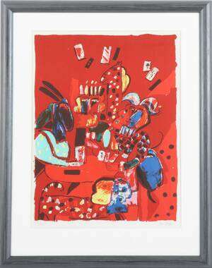 Färglitografi, kortspel. Signerad och numrerad. Inramad. (46x36)