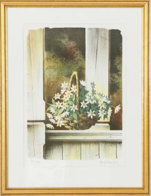 Färglitografi, vitsippor i korg. Signerat och numrerat. Inramad. (36x27)