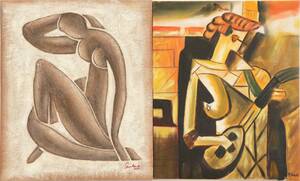 Litografiska blad 2st, motiv med regenter samt oljemålningar 2st, bl.a. Jons-Birgit. Fläckar. (Största rammått 36x45) Läs mer...