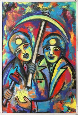 Olja på pannå, guldgrävare. Signerad Elbendari. (91x60)