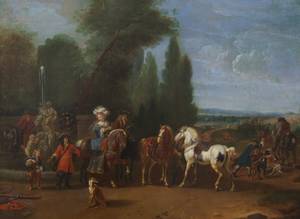 Unbekannter Künstler. 'Höfische Jagdgesellschaft', Öl auf Leinwand, doubliert, unsigniert. 48 x 63cm. Firnis leicht verschmutzt, partiell mit Craquelé, teils mit Abrieb sowie vereinzelt mit leichten Farbverlusten, stellenweise mit Retuschen. JH Transport kann diese Ware zu den JH Lagern in Odense oder Ishøj, Dänemark, für DKK 375, oder zu dänischen Inlandspreisen zu jeder Adresse in Dänemark transportieren. Hvejsel Möbeltransport kann diese Ware zu den Hvejsel Lagern in Aarhus oder Rødovre, Dänemark, für DKK 375, oder zu dänischen Inlandspreisen zu jeder Adresse in Dänemark transportieren.