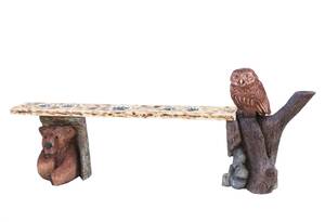 Bänk med skulpturer. I form av björn och uggla. (Höjd 75, längd ca.250)