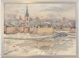 Olja på duk, Stockholmsmotiv. Otydligt signerad och daterad 1942. Dukreva. (23,5x33)