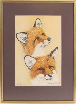 Färglitografi, motiv med rävar. Signerad och numrerad. Inramad. (28x19)