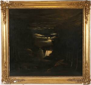 Olja på duk, månbelyst landskap. Signerad Ekelund 1843?. Ram med dekorbortfall. Repor. Mindre färgbortfall och krackelering. (112x125)