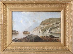 Olja på duk, fjordlandskap med måsar. Otydligt signerad och daterad 96?. I samtida ram. Duklagningar/retuscher. Ram med dekorlagningar och färgbortfall. (25x39)