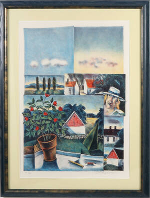 Litografi, 99/190. Komposition med olika vyer. Dagmått 87x60 cm. Ej examinerad ur ram.