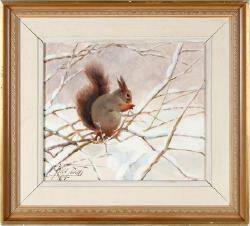 Oljemålning på duk. Ekorre. 29x34 cm.