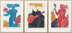 Litografier, tre st. Figurkompositioner samt interiör. Dagmått ca 54x37 cm. Ej examinerade ur ram.