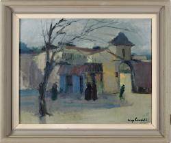 Oljemålning på duk. Figurer i sydländsk by. 49x60 cm.