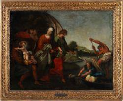 Olja på duk, gammaltestamentligt motiv, troligen Mose i vassen. 1600-tal. Renoverad, retuscherad, krackelerad och yttäckande smuts. Träskuren och bronserad ram, 1700-talets slut. 54x71 cm, ram 64x82 cm.