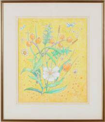 Blandteknik. Stilleben med blommor och fjärilar. Signerad och daterad -88. Dagmått 42x35 cm. Ej examinerad ur ram.