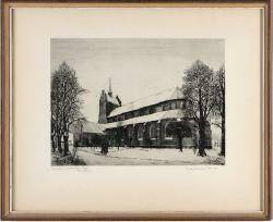 Etsning. St Johannes Baptiste kyrka. Dagmått 42x51 cm. Ej examinerad ur ram.