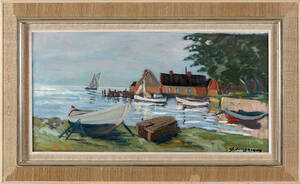 Oljemålning på duk. "Fiskeläge, Öresund". 34x66 cm. Proveniens: Säljes till stöd för Landskrona Direkt.