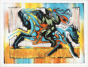 Färglitografi, 12/50. Osignerad. Ridande speleman. Bladets mått 50x65,5 cm. Oramad.