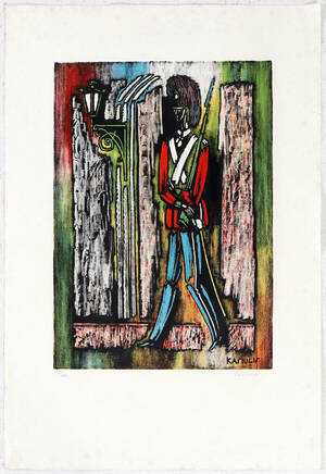 Färglitografi, 107/400. Signerad. Motiv av vaktsoldat. Bladets mått 71x52 cm. Foxing. Två revor i högerkant. Oramad.
