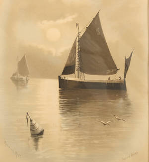 Okänd konstnär, 18/1900-tal. Segelbåtar, "Morning mist". Akvarell på papper. Bildytans mått: 28 x 35,5 cm, mått inklusive ram: 51 x 60 cm. Signerad Joseph Bury. JH Transport erbjuder transport av denna vara till en kostnad av DKK 375 till JH's lager i Odense eller Ishöj, Danmark.