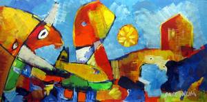 Niels Davernum, komposition "Menneske i fred". Akryl på masonitplade. Mål: 120 x 242 (127,5x250) cm. Sign. Davernum. Bagpå sign. Niels Davernum 2011.