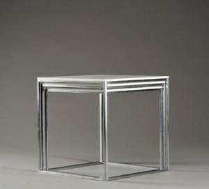 Poul Kjærholm. Et sæt indskudsborde, model PK-71, med stel af børstet stål, plader af hvid akryl. Formgivet 1957. H. 28 B. 28 L. 28 cm. Läs mer...