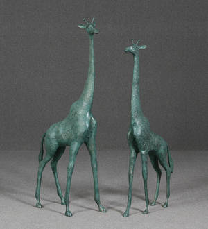 Giraf par i kobberpatineret aluminium. H. 127 & 115 cm. Samlet vægt ca. 16 kg. Varen fremstår i indpakket stand. Varenummer 470093.