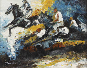 Ubekendt kunstner: Hestevæddeløb. Sign. Barton. Olie på lærred. 32 x 41 cm (39 x 48 cm). Fremstår med lærredsforstærkning langs blændramme.