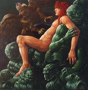 Alberto Abate. 'Prometheus', 1990, Öl auf Leinwand, unten rechts signiert und datiert sowie verso signiert, datiert und bezeichnet 'A. Abate 90 / Promoteica'. Rückseitig mit Galerieetikett 'Helga Wicher / Wuppertal'. 60 x 60cm. JH Transport kann diese Ware zu den JH Lagern in Odense oder Ishøj, Dänemark, für DKK 375, oder zu dänischen Inlandspreisen zu jeder Adresse in Dänemark transportieren. Hvejsel Möbeltransport kann diese Ware zu den Hvejsel Lagern in Aarhus oder Rødovre, Dänemark, für DKK 375, oder zu dänischen Inlandspreisen zu jeder Adresse in Dänemark transportieren.