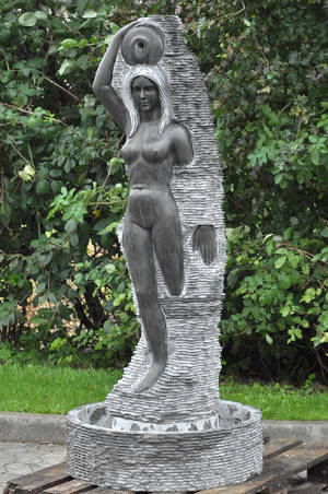 Vandspil i form af kvindeskulptur udhugget i råt og poleret sort marmor. Forberedt til vand. Cirkulationspumpe medfølger. H. ca. 160 cm.
