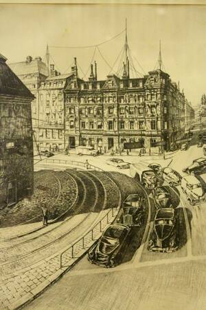 Christian Due, 1956, Stadsmotiv med bilar, 5/100, motivet: 38 x 27.