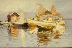 Oljemålning på duk, uppfodrad på pannå. Signerad och daterad 1937. Marint motiv med segelbåtar. 42x53 cm. Läs mer...