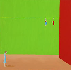 Jens Ulrich Petersen (f. 1947). Hvad laver vi egentlig her? fra serien Snoremænd, olie på lærred, sign. på bagsiden. 80 x 140 cm. Uden ramme. Läs mer...
