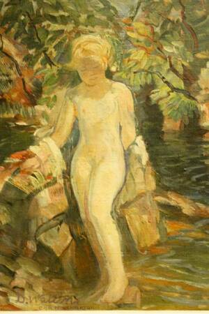 David Wallin (1876-1957), Sverige. Solbad i granskogen, 1917. Signerad. Olja på pannå, 52x38 cm, yttermått inklusive ram: 66x52 cm. David Wallin, född 1876, död 1957 Läs mer...